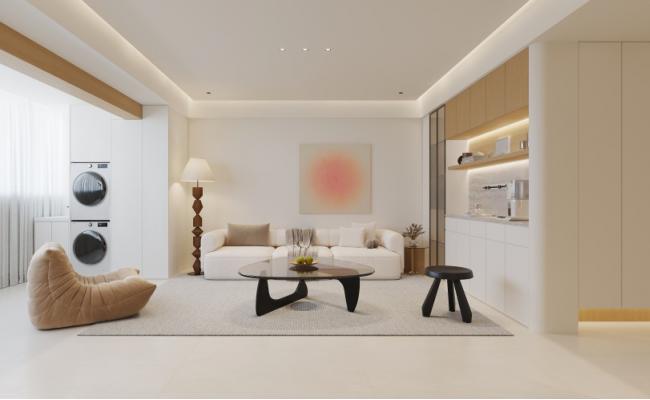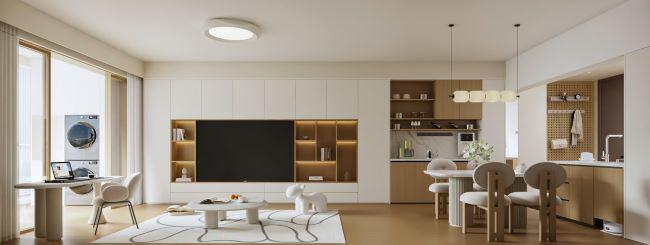 客廳采用開放式布局,并將陽臺整體納入,極大提升了空間的通透性與采光率,營造明亮而舒展的氛圍。墻面選用藝術漆,搭配自然溫潤的木質元素,共同構建出層次豐富、細膩柔和的肌理質感。
